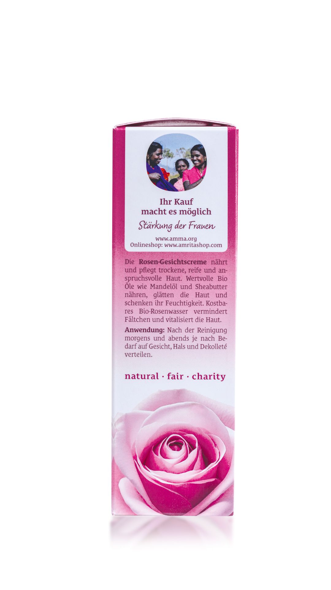 Die reichhaltige, glättende Rosen-Gesichtscreme regeneriert und pflegt anspruchsvolle und trockene Haut. Mit wertvollem Bio-Mandelöl, kostbarer Bio-Sheabutter und erfrischendem Bio-Rosenwasser spendet sie anspruchsvoller Haut intensive Feuchtigkeit. Das Mandelöl mit seinem hohen Anteil an Linolsäure erhält die Elastizität und Hydration der Haut, weshalb ihm ein Anti-Aging-Effekt zugeschrieben wird.